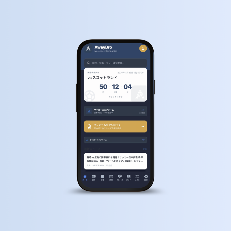 AwayBroは個人開発のプロジェクトです。 W杯2026を現地観戦する全ての日本人サポーターに届けるため、 皆さんの応援が必要です。500円から支援できます。